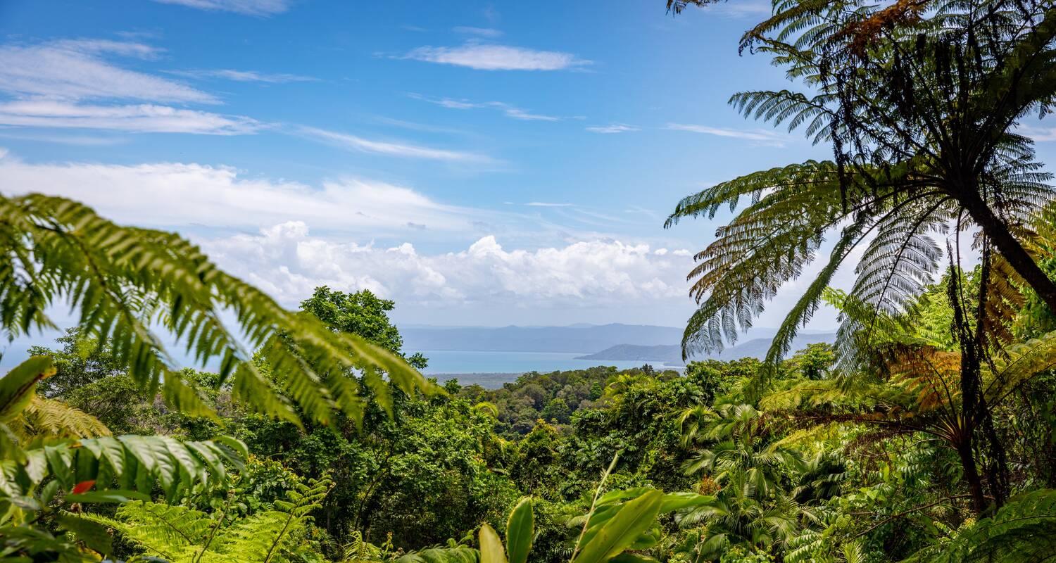 Je rijdt noordwaarts en steekt de Daintree River over per ferry. Je rijd noordelijker en ziet het regenwoud steeds dichterbij de weg komen. In Cape Tribulation wandel je over een houten boardwalk, met varens, palmen en mangroves om je heen. Aan het einde sta je op het strand, waar het regenwoud tot aan het zand reikt en de golven van de Coral Sea binnenrollen.