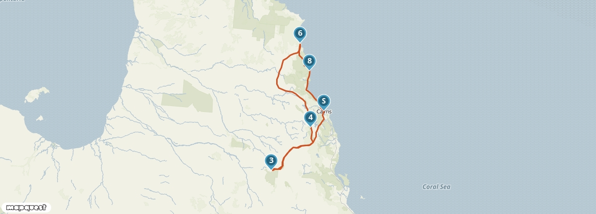 Je rijdt noordwaarts en steekt de Daintree River over per ferry. Je rijd noordelijker en ziet het regenwoud steeds dichterbij de weg komen. In Cape Tribulation wandel je over een houten boardwalk, met varens, palmen en mangroves om je heen. Aan het einde sta je op het strand, waar het regenwoud tot aan het zand reikt en de golven van de Coral Sea binnenrollen.