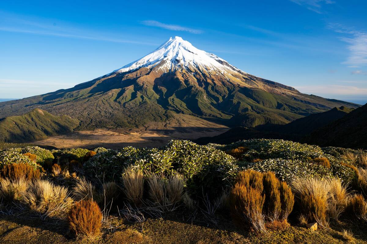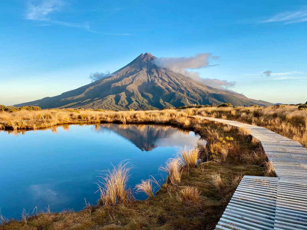 De symmetrische vulkaan Mount Taranaki torent boven de regio uit en vormt het middelpunt van het gelijknamige nationaal park. Je kunt hier wandelen op alle niveaus: van korte bosroutes tot dagtochten naar de bergflanken. Bij helder weer weerspiegelt de besneeuwde top prachtig in omliggende meren en weiden.