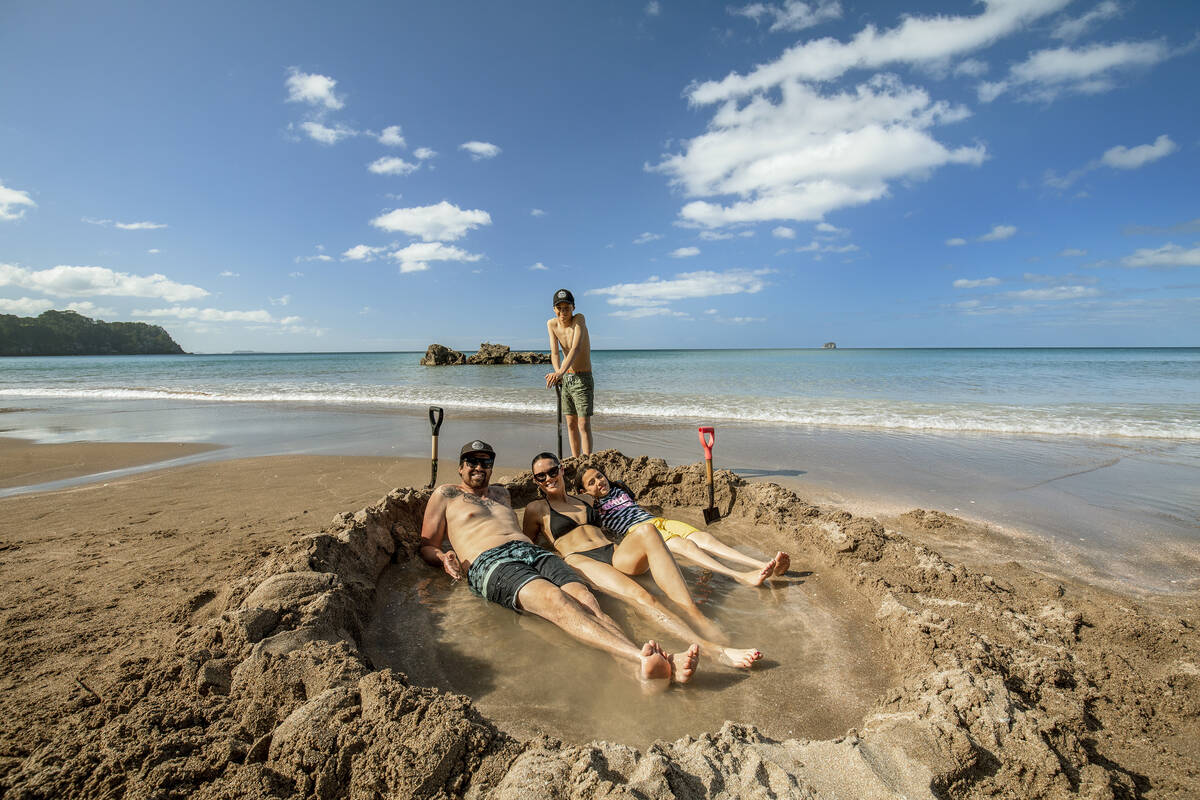 De stranden rondom Hahei zijn één van de mooiste van het hele schiereiland. Vanaf het brede zandstrand van Hahei starten kajaktours. Even verderop begint de wandeling naar Cathedral Cove, dit afgelegen strand is alleen lopend of met een boot te bereiken. De witte kliffen van Speakespeare Cliff zijn ook met een korte wandeling de bereiken. Hot Water Beach kreeg deze naam niet voor niets. Onder het zand zit een warm water reservoir waaruit water omhoog sijpelt. Tussen twee uur voor en twee uur na laag water graaf je hier je eigen jacuzzi in het strand. Het is een druk moment en het stuk strand waar de bron onder zit is beperkt.