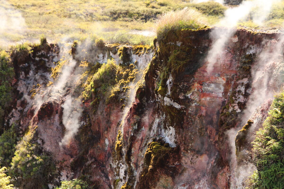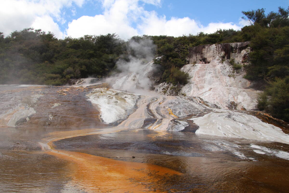 Iets verder van Taupo, maar absoluut de moeite waard, ligt Orakei Korako. Dit thermale park wordt ook wel ‘The Hidden Valley’ genoemd en is wat minder druk bezocht. Met een korte boottocht steek je de rivier over naar een surrealistisch landschap vol felgekleurde terrassen, stomende bronnen en een zeldzame geothermische grot. Dit is een van de meest actieve en fotogenieke warmwatergebieden van Nieuw-Zeeland.