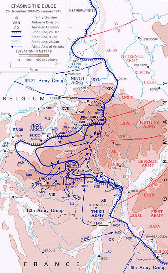 Een geallieerd tegenoffensief moet de Duitsers uit de Belgische Ardennen en Luxemburg verjagen. Onder bevel van Eisenhouwer probeert men de Duitsers te omsingelen. Een traag proces: de Amerikaanse soldaten zijn niet voorbereid op de winter in de Ardennen, terwijl de Duitsers al drie jaar in Oost-Europa overwinterden. Door de barre omstandigheden focust men zich noodgedwongen op de verdediging van de verbindingslijnen en knooppunten.