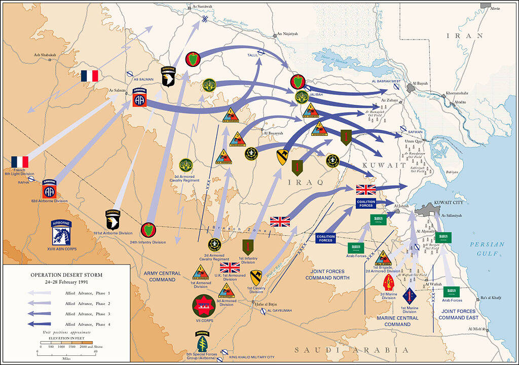 Al snel bleek dat de coalitie sterker was en werden diverse Irakese stations, bestuurlijke centra en systemen platgelegd. De coalitietroepen, die tot dan toe voornamelijk vanuit buurlanden als Saudi-Arabië hadden gevochten, trokken het door Irak bezette Koeweit steeds verder binnen. De Iraakse soldaten gaven zich na kortstondige gevechten doorgaans vrij snel over, waardoor de coalitietroepen gestaag konden doorstoten. Op 27 februari riep Hoessein de Iraakse troepen terug en kon de hoofdstad van Koeweit bevrijd worden. De oorlog was voorbij.